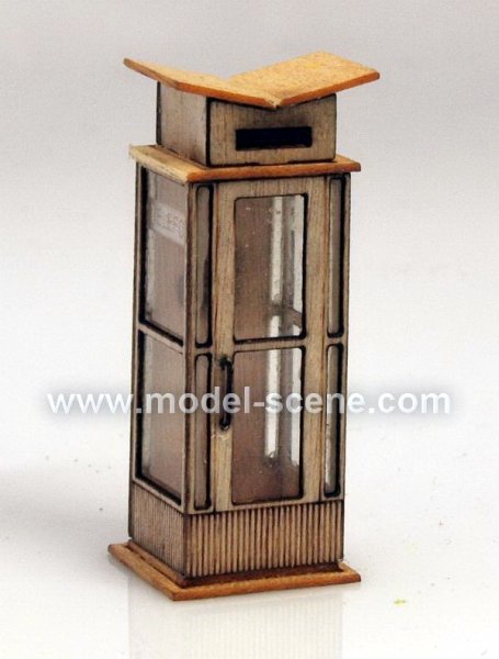 Klasická telefonní budka ze 70. a 80. let 20. století, která obsahuje imitaci tel. automatu vč. tel. sluchátka a acetátovou fólii k zasklení budky.