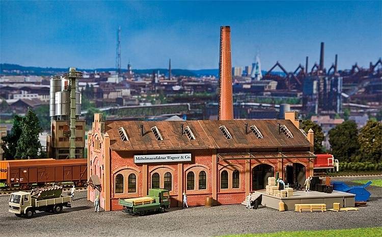 Stavebnice modelu továrny na nábytek skládající se z administrativní budovy a výrobní haly, vybavené stroji, starožitným nábytkem, zastřešenou nákladní rampou, venkovními kontejnery a různými dalšími dekoračními díly. Komín je navržen tak, aby mohl být namontován generátor kouře. Patinovaný model. Rozměr: 340 x 270 x 275 mm
