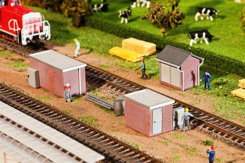 Stavebnice tří patinovaných modelů trafostanic různých velikostí. Rozměr: 61 x 28 x 29 mm, 38 x 28 x 29 mm, 36 x 34 x 37 mm