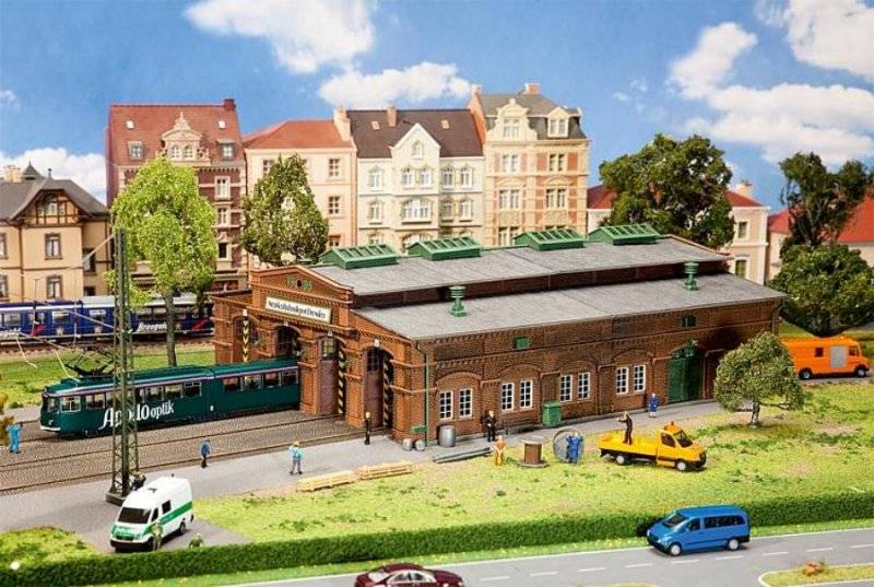 Stavebnice tramvajové vozovny podle skutečného modelu v Drážďanech. 4 stání s pohyblivými dveřmi. Výška dveří: 65 mm, šířka dveří 35 mm.