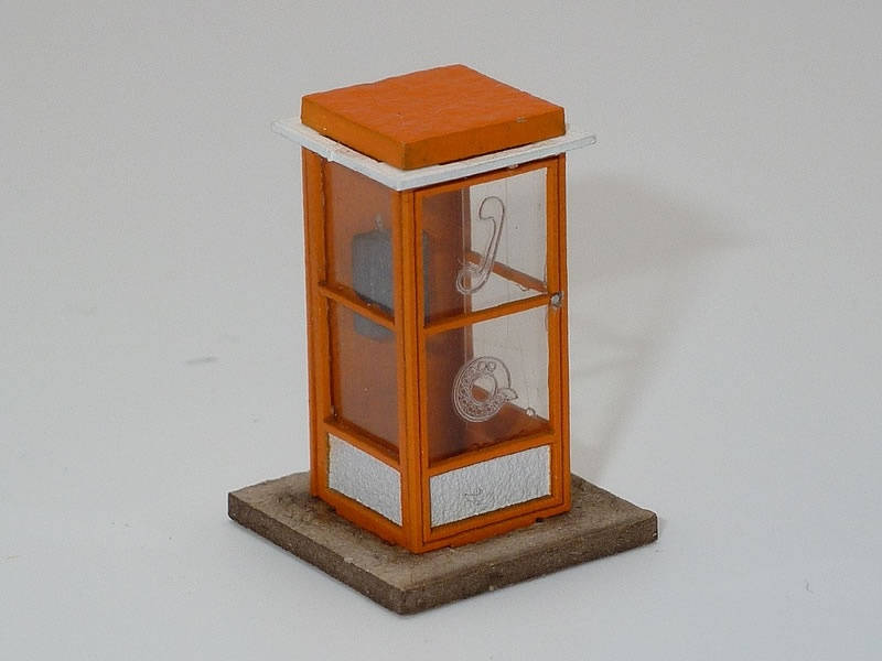 Telefonní budka oranžová. Laserem řezaná stavebnice. Včetně návodu a lepidla.