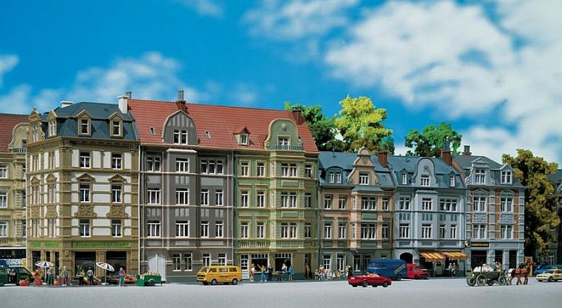 Stavebnice modelu čtyř řadových domů, 2-4 patrových. Stvaebnice obsahuje ploty, zdi a drobné stavby zadních dvorků jak je vidět na obrázku. Rozměr: 500 x 180 x 245 mm