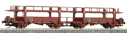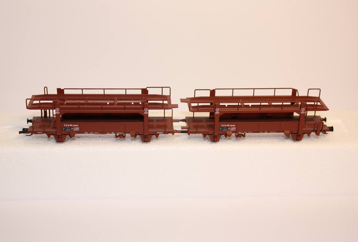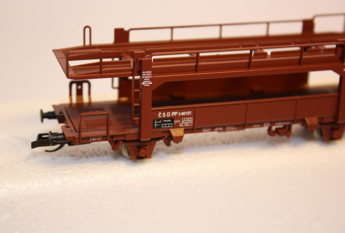 Plošinový dvoupatrový nákladní vůz na přepravu aut drah ČSD, kulisa na krátké spřáhlo. Délka: 166mm. Vagón má náhradní obal
