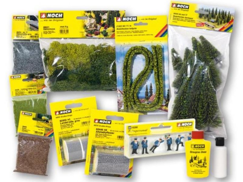 Set obsahuje vše, co potřebujete k vytvoření finální podoby kolejiště či scenérie: silnice, štěrk, tráva, stelivo, mech, stromy, živé ploty, lepidlo atd. Ideální také jako dárek pro začátečníky modeláře ale i profesionály. Obsah balení: 09374 štěrk šedý H0/TT 250 g, 08310 travní posyp letní louka 20 g, 08100 elektrost. nádoba na statickou trávu, 08440 posyp oranice 42 g, 60500 silnice šedá 1 m, 60440 dlažební kostky 1 m, 08621 dekorativní mech zářivě zelený a tmavě zelený 75 g, 21522 živý plot světle zelený 50 cm 2 kusy, 26420 jedle 10 ks, 15280 postavičky železničářů 6 ks, 61130 lepidlo na posypovou trávu 50 ml.
