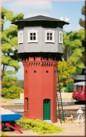 K zásobování parních lokomotiv vodou jsme vytvořili tuto malou vodárenskou véž. Atraktivním prvkem je především struktura cihlového zdiva s jemnými detaily kombinovaná s dřevéným obložením. K vodní nádrži vede propracovaný žebřík. 40 x 40 x 130 mm