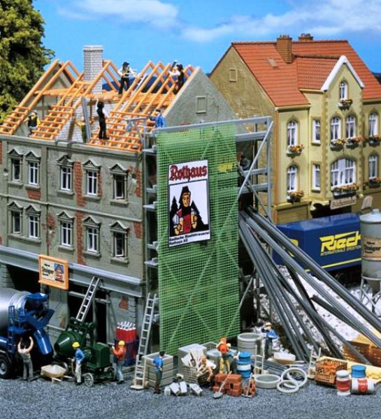 Sada doplňků pro staveniště jako např. lešení, bezpečnostní síť, fošny, palety s cihlami, sudy, pytle, stavební materiál a spousta dalšího příslušenství.