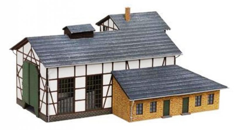 Stavebnice Laser-Cut remízy "Tannau", ručně malované a patinované. Jedno stání. Maximální délka pro lokomotivy: 17.0 cm Rozměr: 25 x 18 x 12,5 cm