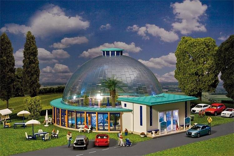 Stavebnice modelu wellness centra s bohatým vybavením: nádrž s podvodním LED osvětlením (součást dodávky), lehátka, stoly, palma uprostřed haly a další příslušenství. Model může být sestaven buď s prosklenou kopulí nebo bez. Rozměr: 281 x 244 x 138 mm