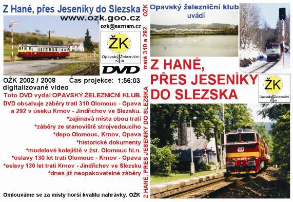 Z Hané, přes Jeseníky do Slezska DVD obsahuje záběry z tratí 310 Olomouc-Opava a 292 v úseku Krnov - Jindřichov ve Slezsku. Záběry přibližují zajímavá místa na tratích, lokomotivní depa v Olomouci, Krnově a Opavě, historické dokumenty, modelová kolejiště v žst. Olomouc hl.n. a záběry z oslav 130 let na trati Olomouc - Krnov - Opava a 130 let na trati Krnov - Jindřichov ve Slezsku. Digitalizované video, 166 minut