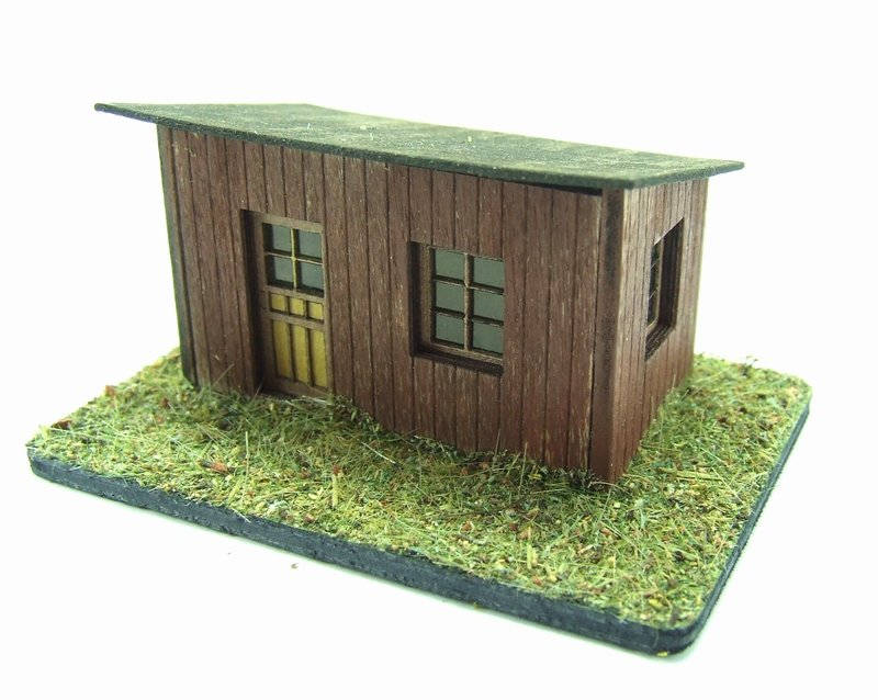 Zastřešená zastávka v hnědém provedení je laserem vyřezaná ze dřeva. Okna a dveře jsou z tvrdého kartonu.