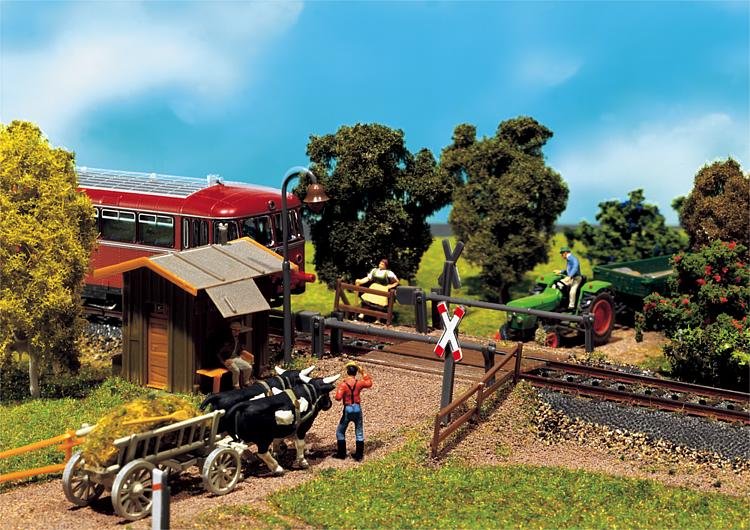 Model vhodný na všechny rovné i zakřivené koleje. Přejezd je s domečkem závoraře a pohyblivými závorami. Rozměr: 130 x 120 x 50 mm