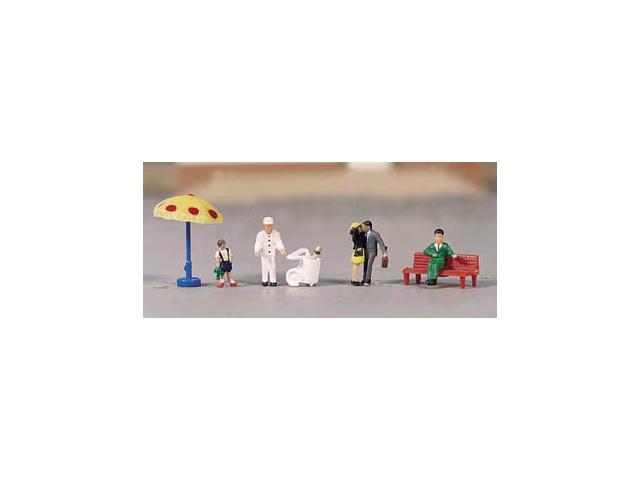 5 postaviček, slunečník,lavička, zmrzlinářský vozík.
