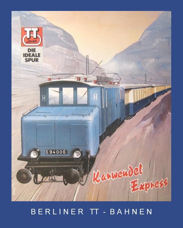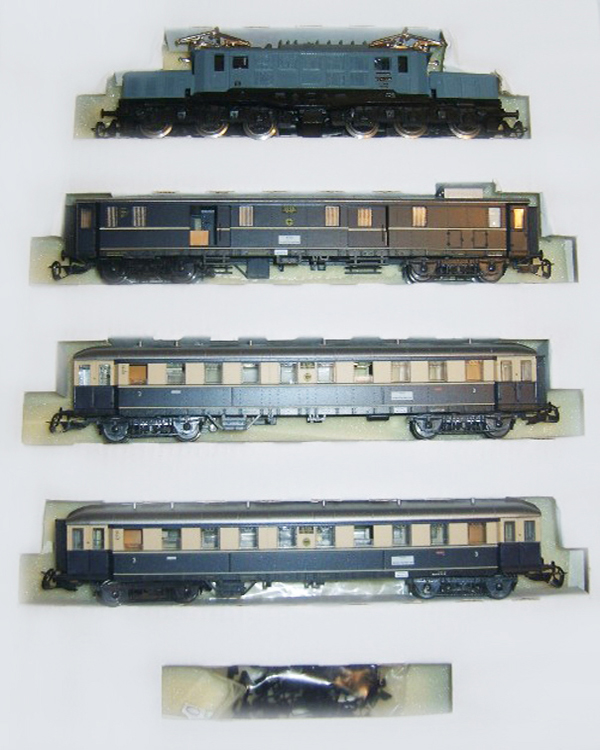 Rychlíkový set Karwendl - Express. Tento set obsahuje elektrickou lokomotivu pod označením E94 006, která je drah DRG dále dva rychlíkové vozy modré barvy a jeden poštovní rychlíkový vůz rovněž modré barvy. Lokomotiva má naháněny čtyři nápravy z toho jsou dvě opatřeny bandážemi pro zvýšení tahu, osvětlení se automaticky přepíná dle směru jízdy. K vozům náleží doplňky které je nutno dolepit. Set má originální krabici i průvodní list. Výrobcem je: Tillig a Zeuke Stav: nové